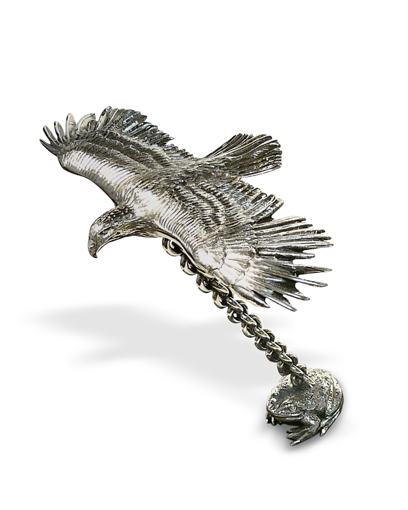 Seine Aufmerksamkeit richtete sich auf die Vereinigung der Gegensätze. Der Vereinigung von Intellekt und Instinkt, des Geistes und der Materie diente sein Werk.¹ Die Lehre des Schmelzens und Gießens ist mit der Alchemie gemeint. Aus Erfahrung wissen wir Goldschmiede, dass beim Zusammenschmelzen von verschiedenen Metallen ein drittes Metall, eine Legierung mit veränderten Eigenschaften als die zwei einzelnen Metalle sie haben, entsteht. Die Form des flüssig gegossenen Metalls ist nach seiner Erstarrung ebenso eine neue. Formen und Eigenschaften verändern sich durch energetische Prozesse und die Vereinigung von Gegensätzlichem. In der Psychologie ist es die Transformation, die durch die Beziehung von zwei Gegensätzen aufeinander zu einem neuen Bewusstsein führt. Gegensätze bedingen sich einander in einem dynamischen Entwicklungsprozess. Der Geist und Intellekt, der durch den Adler verbildlicht wird, muss mit der Kröte, dem Erdhaften und der Materie in Verbindung bleiben und umgekehrt, damit Beides befruchtet wird. In diesem Bild werden die Gegensätzlichkeiten, aus denen unser Leben und unser Kosmos besteht in sehr anschaulicher Weise dargestellt. Diese tiefgründige Symbolik war Grund genug, um sich mit der Gestaltung dieser Skulptur aus massivem Silber auseinander zu setzen. Die Anfertigung dieser Figur war ein Auftragswerk. Es ist immer wieder ein Erlebnis und das Faszinierende in unserem Beruf, sich mit Themen, die an uns herangetragen werden, in anspruchsvollen Werken auseinandersetzen zu dürfen.