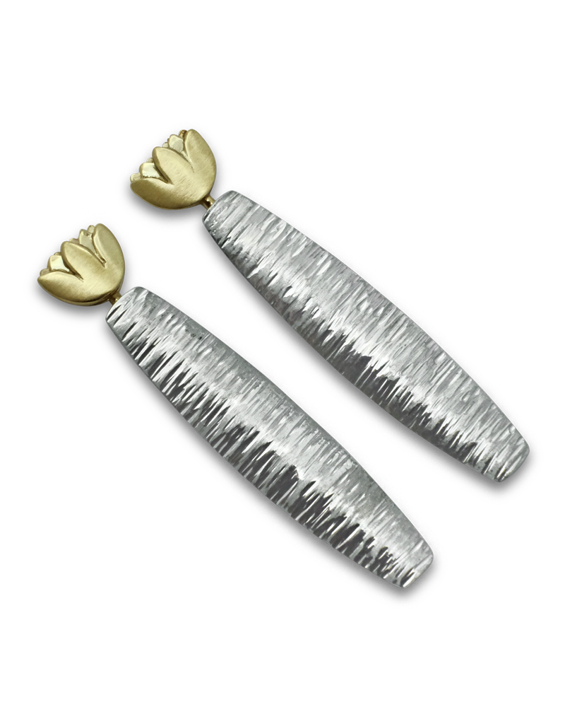 Zwei goldene Lotusblüten wachsen aus den dunklen Tiefen des Sees an die Oberfläche. Makellos entfalten sie dort ihre volle Schönheit. Der Ohrschmuck zeigt ein wunderbares Sinnbild für die eigene Schöpferkraft im Leben. Die Ohrringe mit den leicht zu beiden Seiten gewölbten Silberteilen wirken weicher in ihrer Form, als die geradlinigen Formen des goldenen Lotusschmuckes in unserer Kollektion. Je nach Typ der Schmuckträgerin kann der eine oder andere Lotusohrschmuck perfekt zu ihr passen. Das Ohrschmuckpaar ist eine Handarbeit, geprägt vom Eigensinn der Goldschmiede Caroline Creation. Die Schönheit der Lotusblüte und ihre Bedeutung wurde versucht in diesem schlichten Unikatschmuck auf eigene Weise zu gestalten. Die aus massiven 585/- Gold gefertigten plastischen Lotusblüten bringen Wert und Beständigkeit für das Schmuckstück.