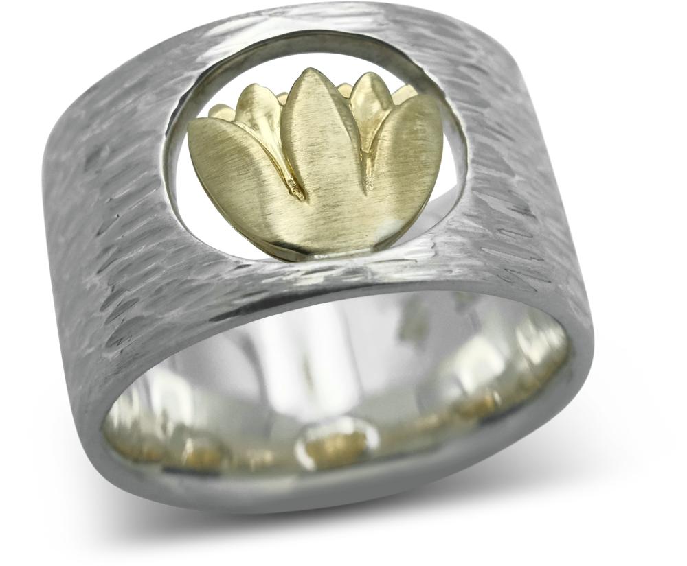 Der Goldene Lotus tritt hier aus den Tiefen des Sees strahlend wie die Sonne hervor. Er entfaltet in diesem Bandring seine Blütenblätter zu einer zauberhaften Blüte. Auf der glitzernden Wasseroberfläche, geprägt durch den Hammerschlag kommt die Lebendigkeit der unendlichen Schöpferkraft des Goldenen Lotus zu seinem Ausdruck. Getragen, verfehlt dieser Ring seine Wirkung nicht. Er erzählt ebenso von der Entwicklung der persönlichen Entfaltung im Leben seiner Trägerin. Die aus massiven 585/- Gold gefertigte plastische Lotusblüte bringt Wert und Beständigkeit in den breiten Silberring. Es ist eine Handarbeit, geprägt vom Eigensinn der Goldschmiede Caroline Creation.